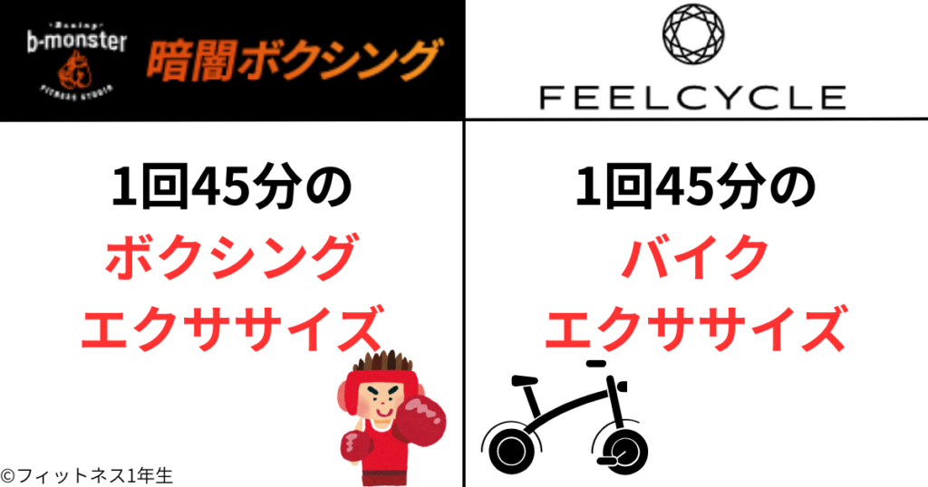 どちらもエキサイティングな暗闇フィットネスですが、b-monster(ビーモンスター)はボクシングフィットネス、FEELCYCLE(フィールサイクル)はバイクフィットネスという違いがあります。