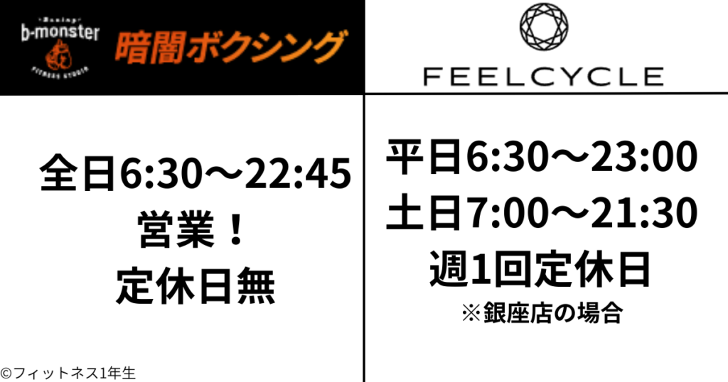 FEELCYCLEは店舗によって営業時間・定休日が異なる場合があるため、比較軸を揃えるために銀座スタジオ同士を比較しました。