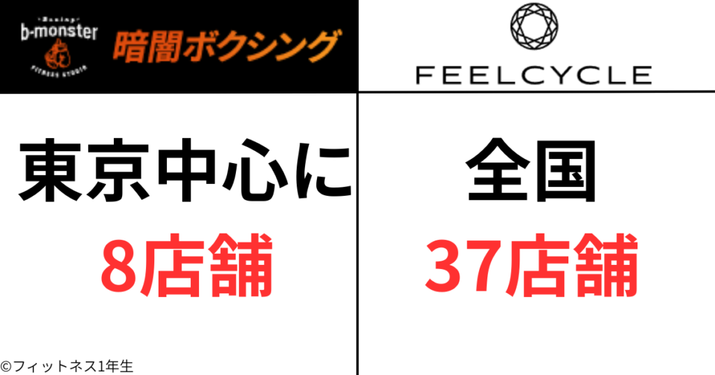 b-monster(ビーモンスター)は東京を中心に8店舗なのに対し、FEELCYCLE(フィールサイクル)は全国展開し37店舗以上あります。