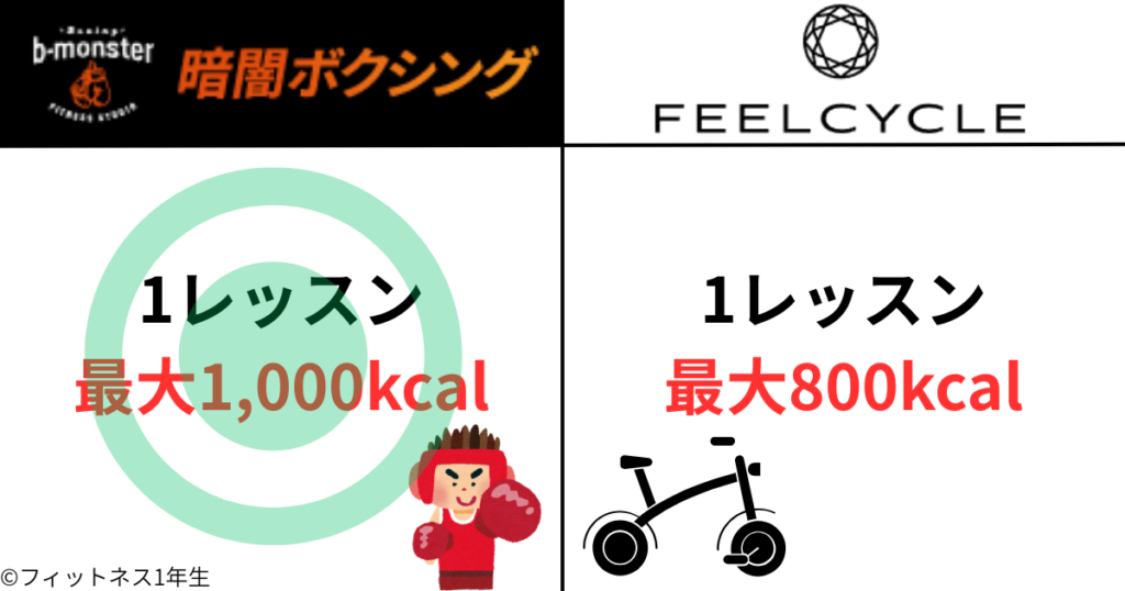 b-monster(ビーモンスター)の消費カロリーが最大1,000kcalと言われているのに対して、FEELCYCLE(フィールサイクル)の消費カロリーは最大800kcalと言われています。