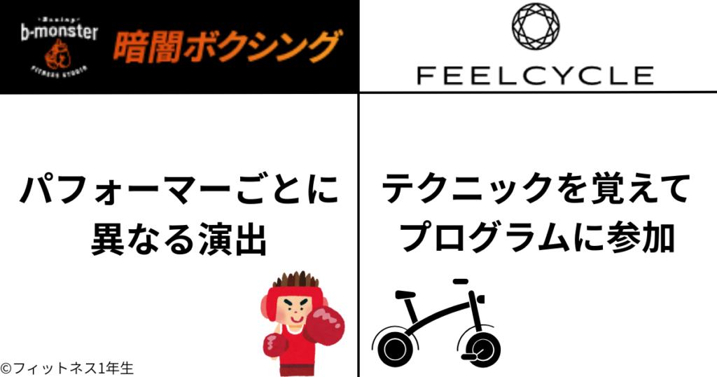 | 4)それぞれの 唯一無二ポイント | ・パフォーマーごとに異なる演出 ・ボクシングだけでなくHIITトレーニングが要素あり、ボディメイク効果が高い | ・動きのテクニックを覚えてプログラムに当てはめる ・バイクなのにこんなに動きのバリエーションがあるのか!という驚きがある |