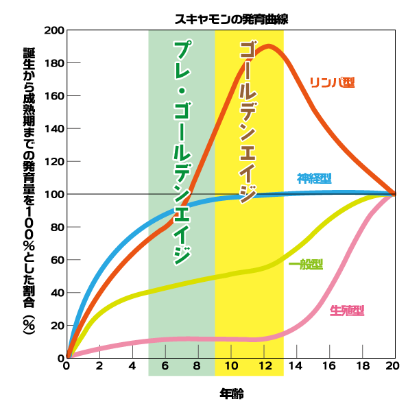 このうち神経型の発達は、幼少期から急速に進み、9〜12歳頃にほぼ完成に近づくとされています。