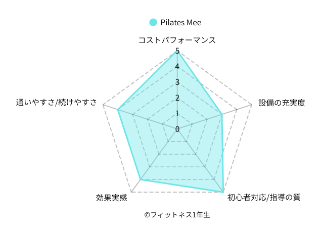 もう少し詳しく理解するため、5項目でPilates Mee(ピラティスミー)を評価してみました。
