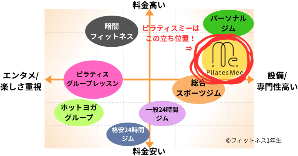 まず、Pilates Mee(ピラティスミー)が様々なジャンルのスポーツ施設のうち、どのような立ち位置にいるか図解しました。