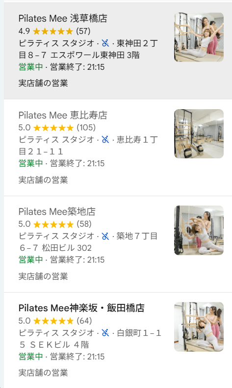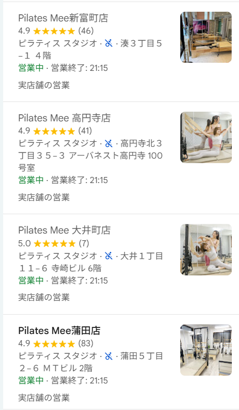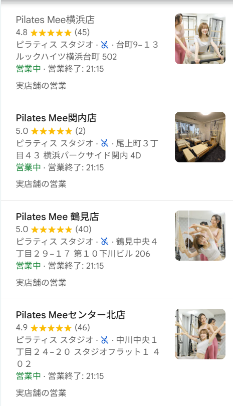 当サイトでは、Pilates Mee各店舗に寄せられたGoogleマップの口コミ評価を1400件超、独自集計を行いました。