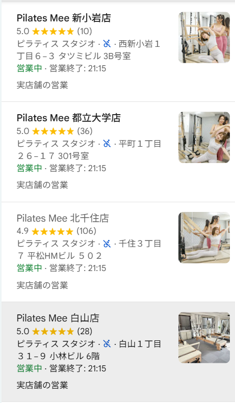 今回当サイトでは、主にGoogleマップ「Pilates Mee(ピラティスミー)」各店舗に寄せられた口コミのうち35店舗のレビューをピックアップし、内容を分析しました。