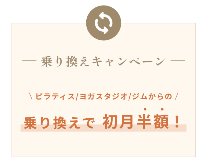 乗り換えキャンペーンは、他のピラティス・ヨガ・ジムからの乗り換えで初月が半額になるキャンペーンです。