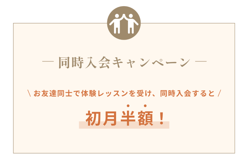 同時入会キャンペーンは、友人・家族同士で体験レッスンを受け、当日に同時入会すると適用になります。