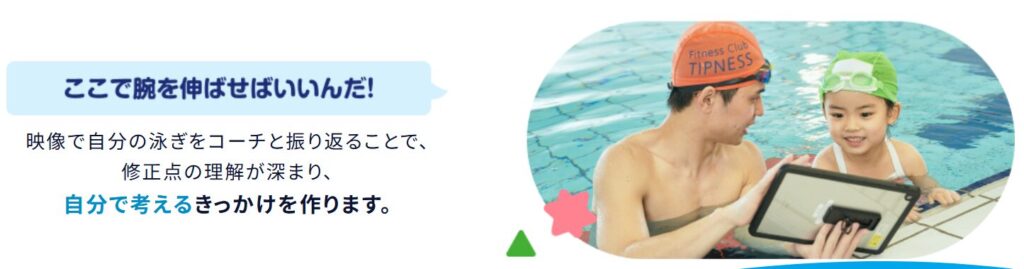 自分の泳ぎを映像で確認し、「どこが良かったか」「次は何を意識すればよいか」を子供自身が理解できるため、受け身になりにくく、主体的に練習へ取り組めます。