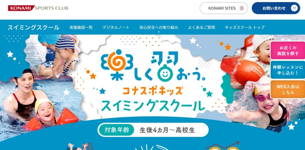 | コナミスポーツクラブ コナスポキッズ | 動画ノート活用で「考えて泳ぐ」知育重視。技術定着がスムーズ | 4か月~小学生以上 | 都内複数 (18店舗) |